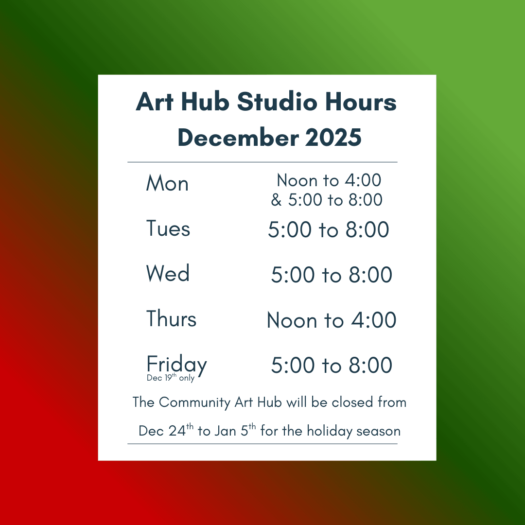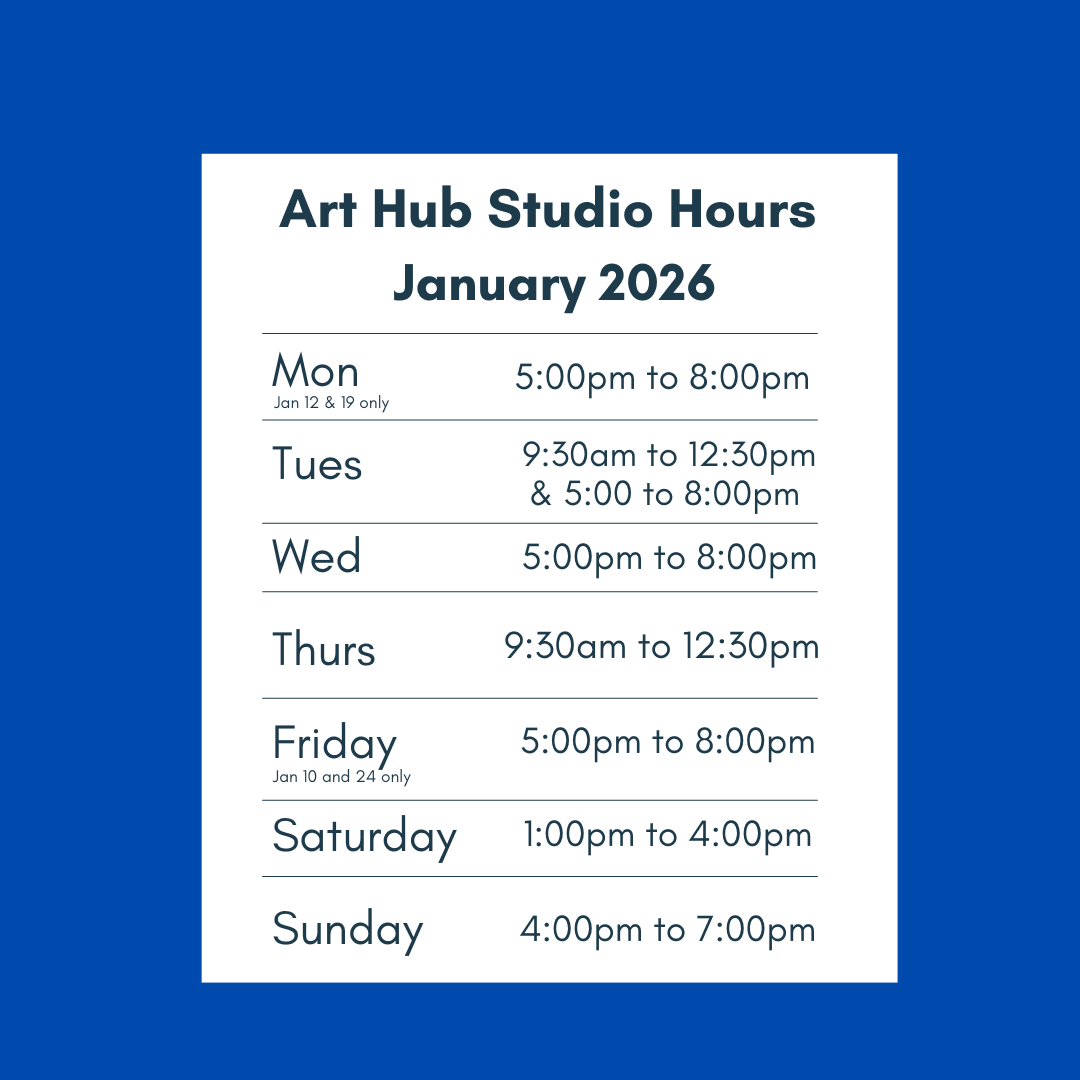 Our Drop in Hours change seasonally because we are run by volunteers, so stay tuned to our socials and the Art Hub web page for our current drop in hours.