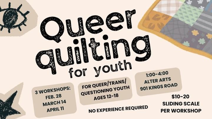 Workshop 1 February 28, 2026 - 1:00pm-4:00pm: Queer quilting - Explore queerness through the art of quilting. You will learn and practice basic quilting skills and bring home a small quilted project.